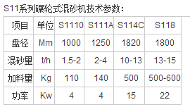 S11系列碾輪式混砂機是一種高效低耗,機構新穎的小型混砂機。該機的基本參數,如加料量、主軸轉速、碾輪尺寸等,是 在參考國外同類產品的基礎上,經過反復試驗而確定的,既先進合理,又適于國情。而且還采用了彈簧加壓、氣壓加水、集中潤滑、輝綠巖鑄石護板等新結構、新材 料,對保證型砂質量,提高生產率,延長使用壽命,均起了重要作用。